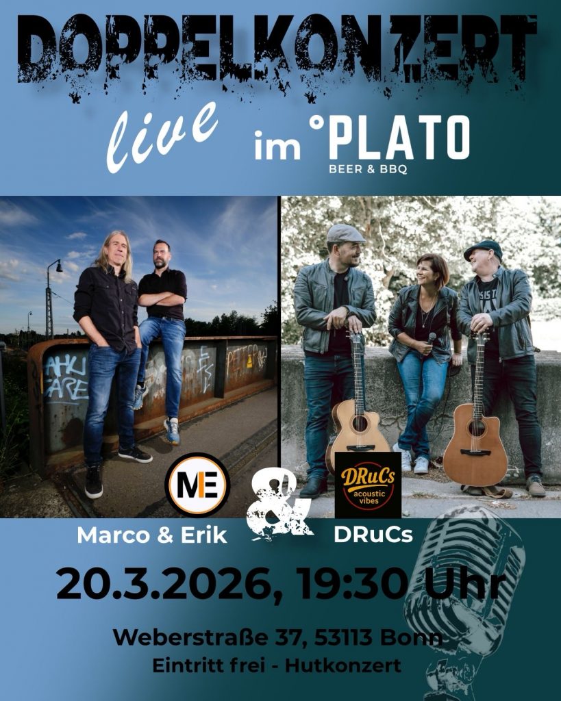 Ein Abend – doppelter Spaß! ME und DRuCs verzaubern das Plato mit akustischen Klängen.